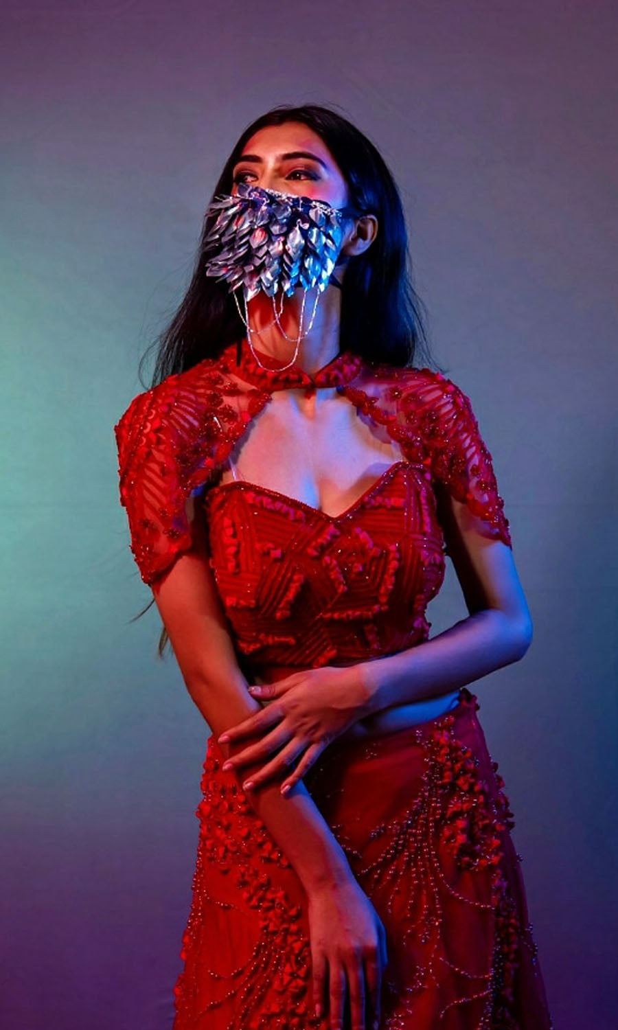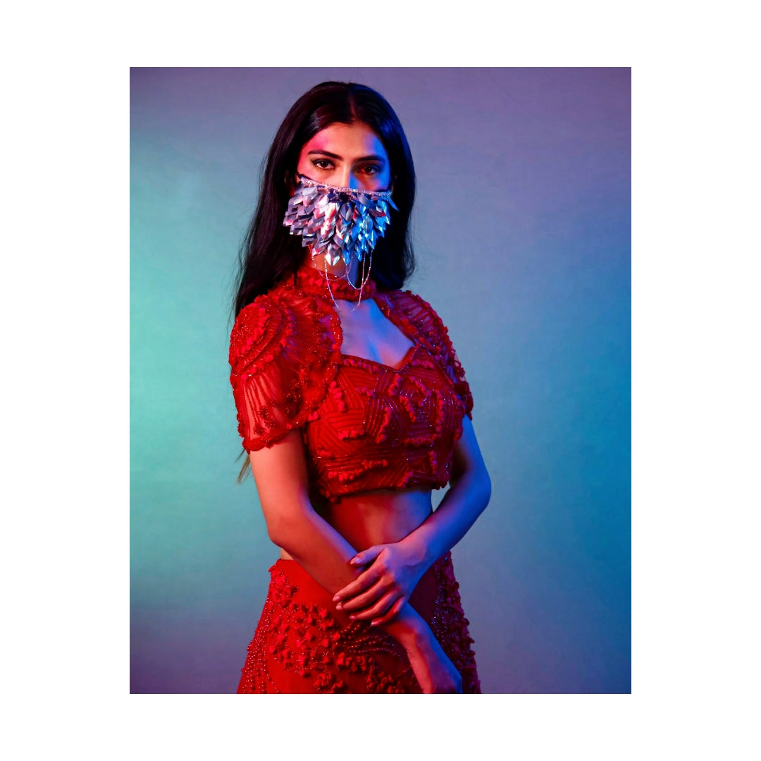 Blood red cape lehenga with intricate embroidery all over, perfect to go out for cocktails and your friend's sangeet