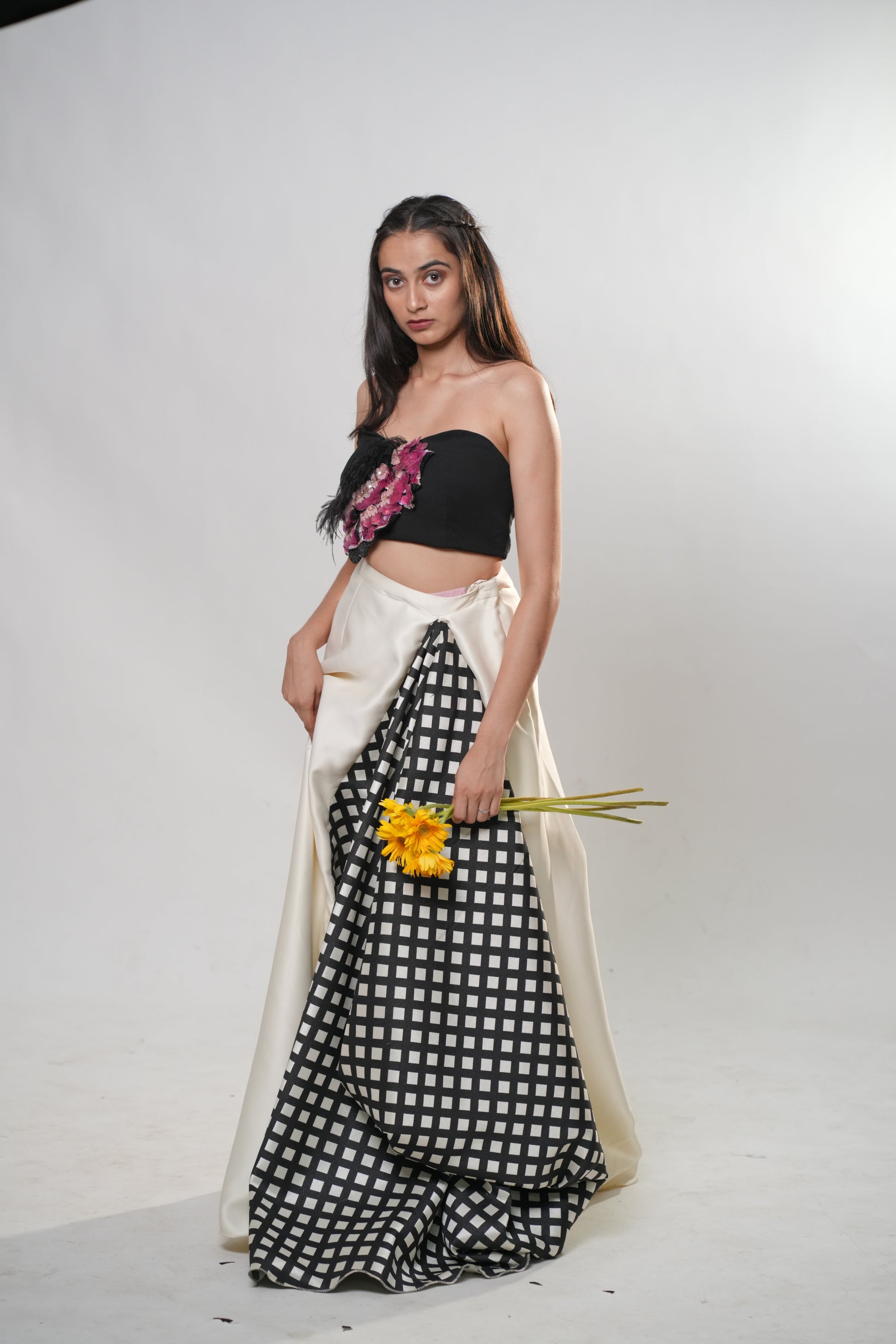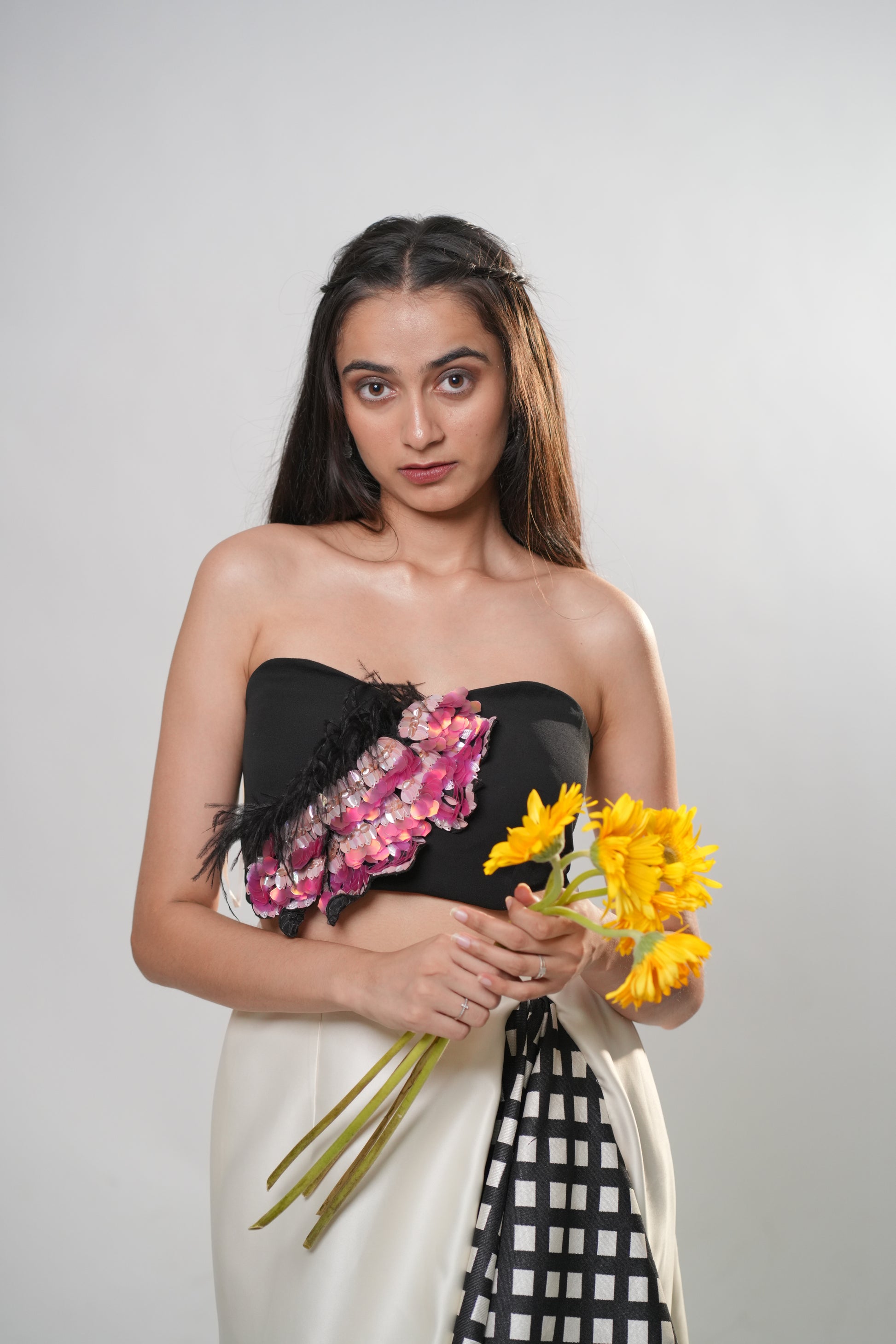 Step into the spotlight in this chic modern dress featuring a striking black bustier adorned with exquisite feather embellishments and playful pink sequins. The skirt, a stylish blend of white and black checkered print on one half, adds a bold contrast that captures attention. Perfect for glamorous evenings and lively parties, this dress seamlessly combines elegance with a contemporary edge, ensuring you make a memorable statement at any event.