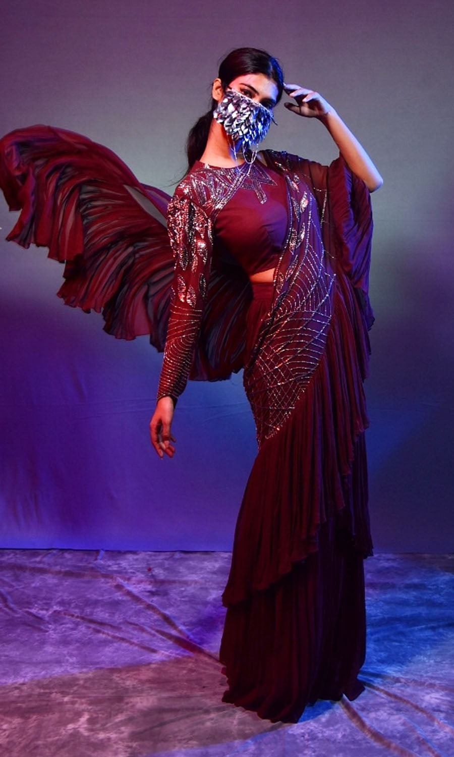 Chocolate brown drape saree with intricate hand embroidery and micro pleated skirts