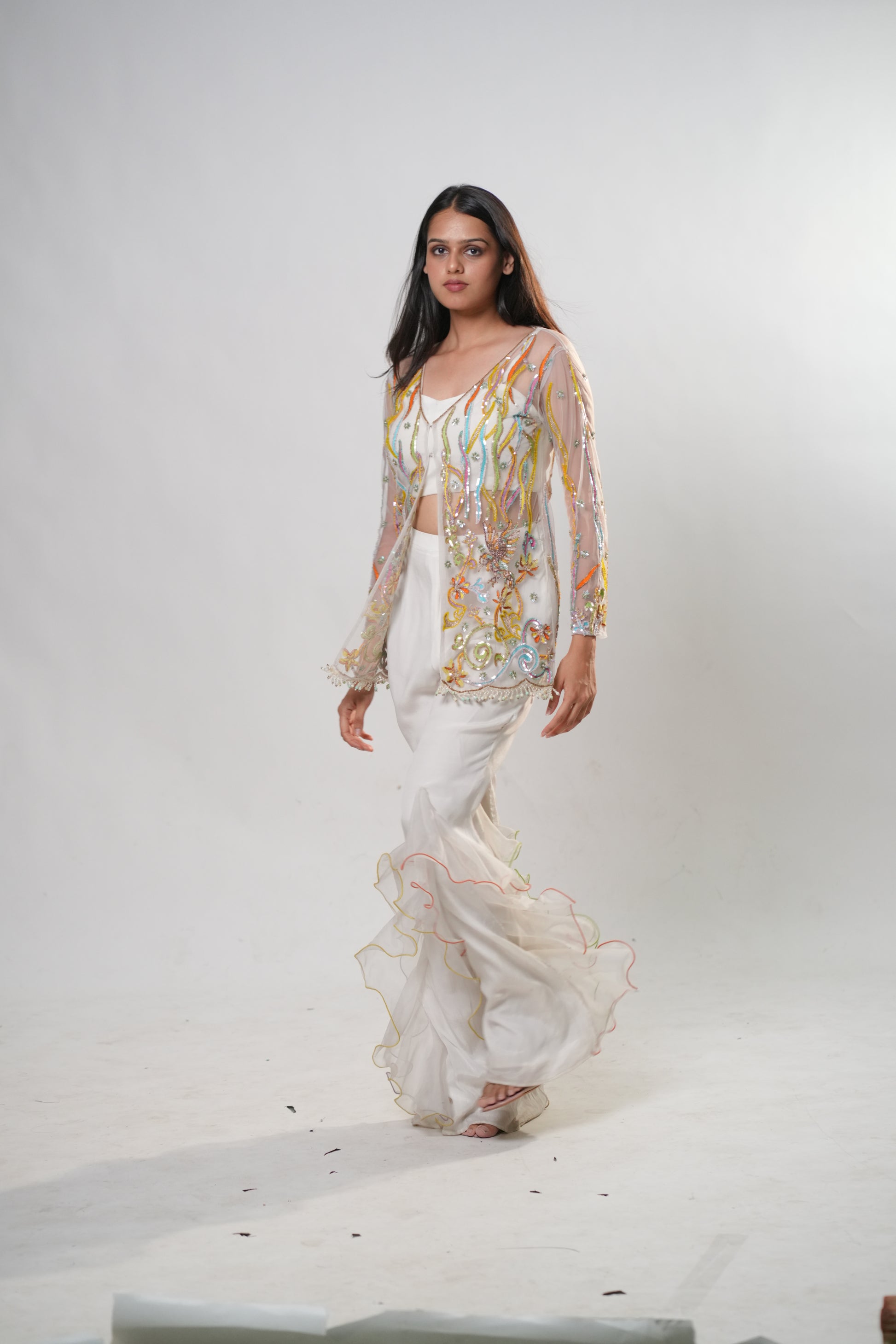 Step into elegance with our stunning white bustier and pants dress, complete with a chic hand-embroidered jacket. Perfect for evening celebrations, this ensemble features fitted pants that flare into a graceful fish tail, adding a touch of drama to your look. Whether you're heading to a cocktail party or a festive gathering, this outfit ensures you stand out with sophistication and style.