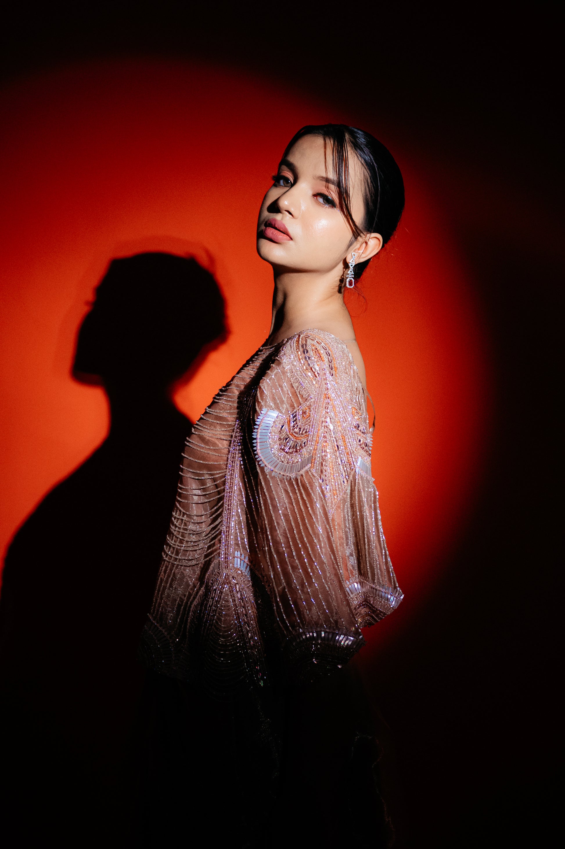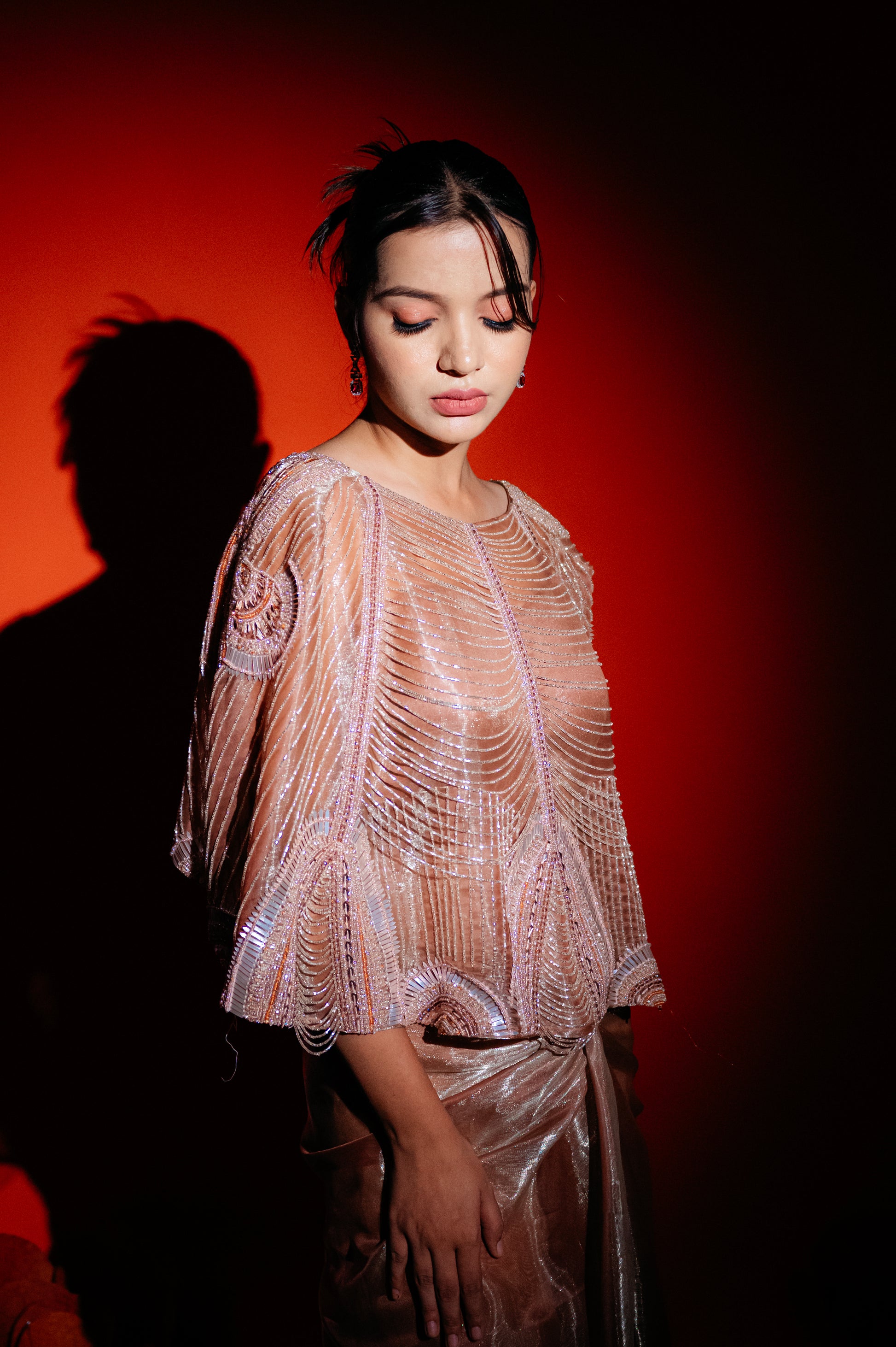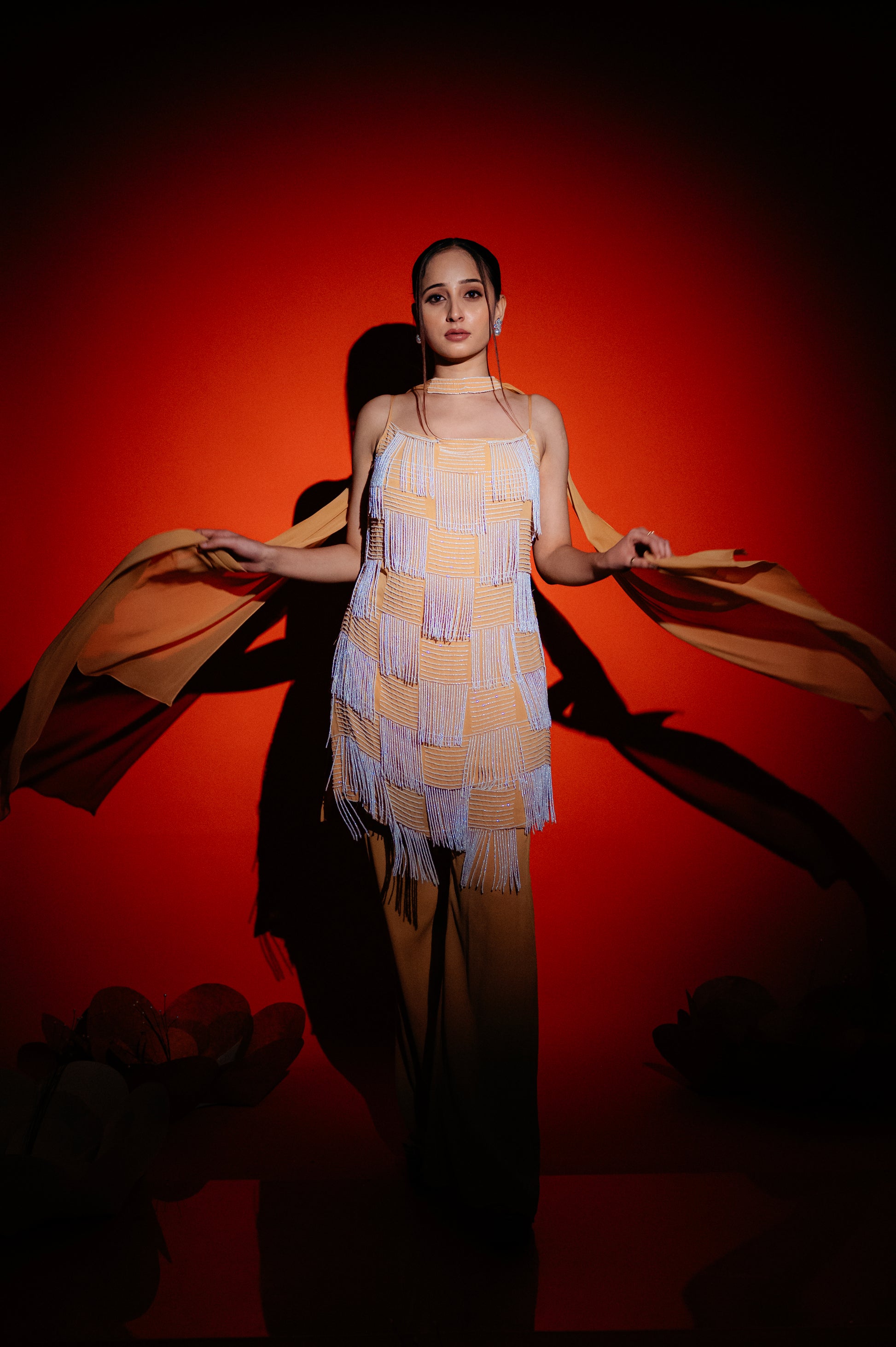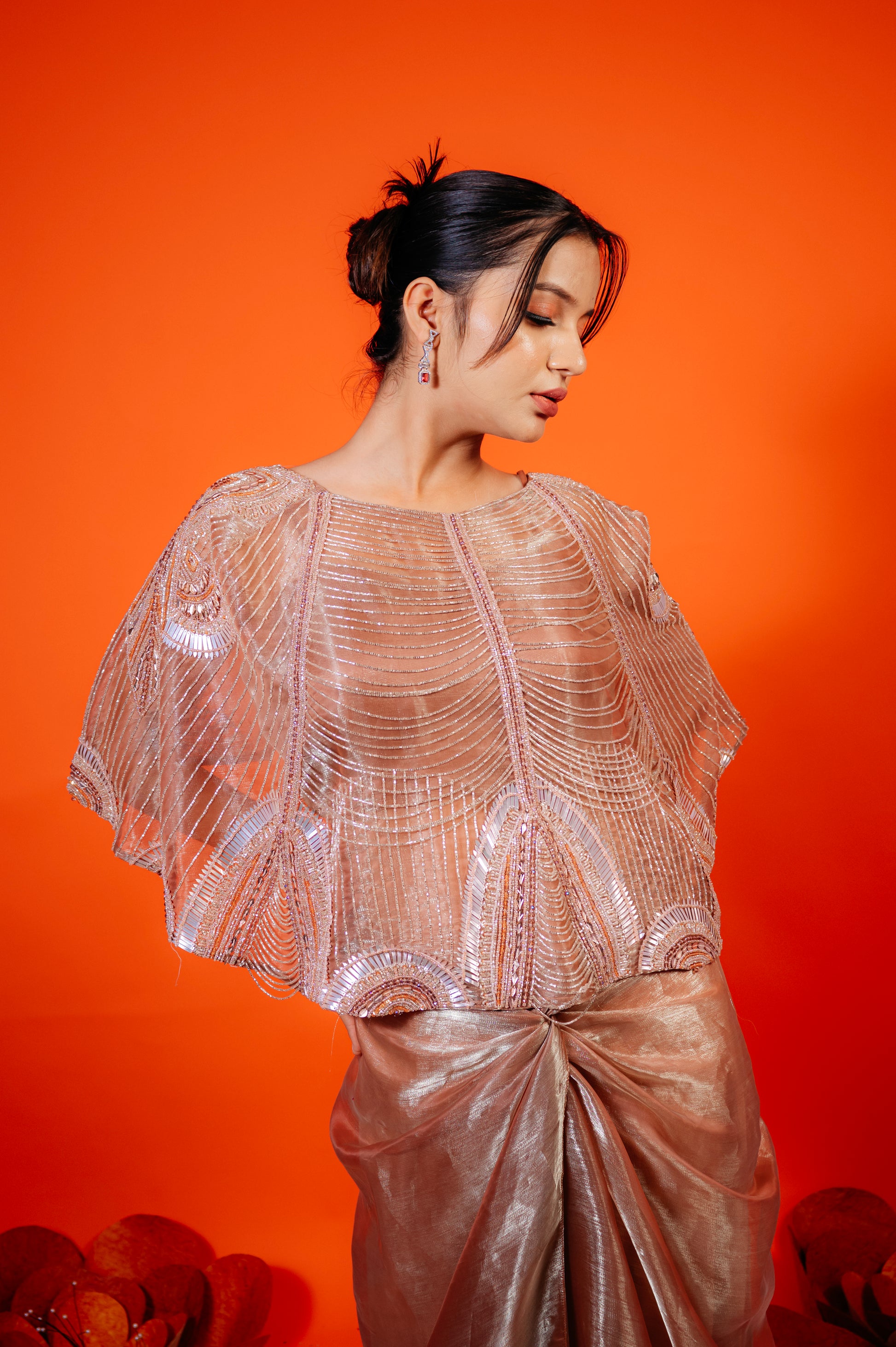 The Fern Whimsy drape saree is a graceful and enchanting outfit featuring delicate fern-inspired patterns and a flowing, elegant drape. Its design combines nature-inspired motifs with a whimsical touch, resulting in a sophisticated and visually captivating saree. The fabric, likely rich and soft, enhances the saree's luxurious feel while maintaining a whimsical charm.