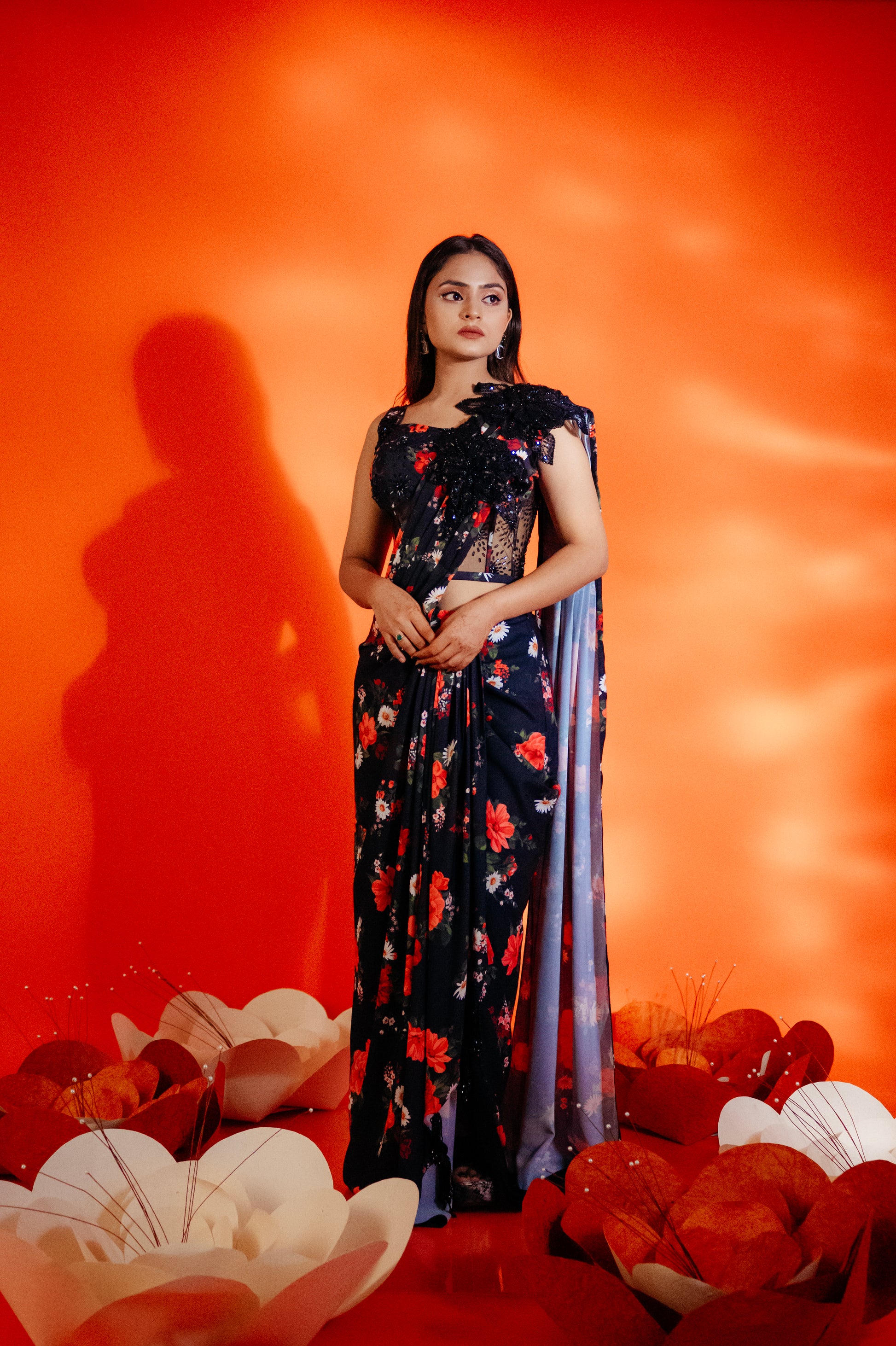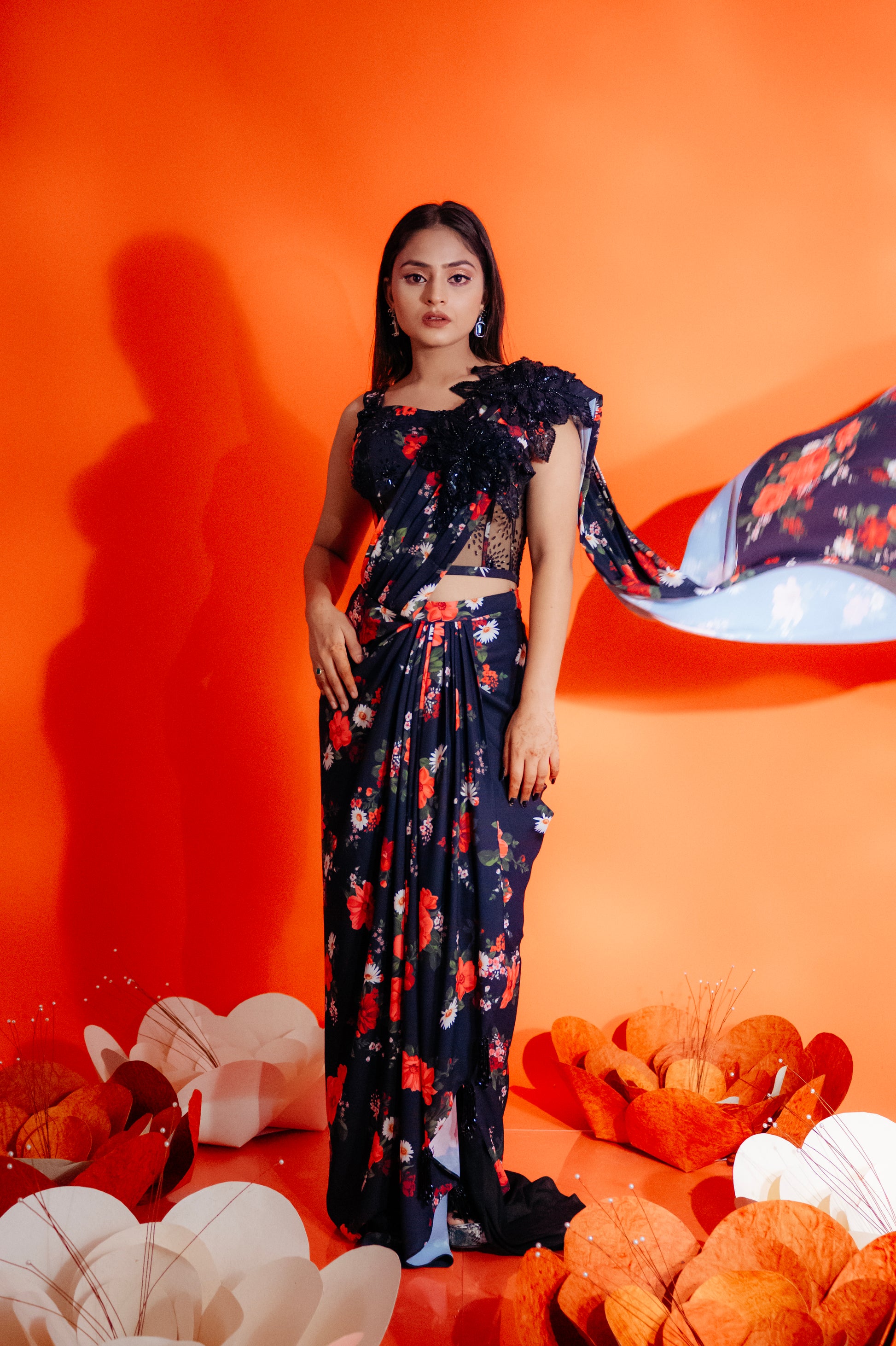 Embrace timeless elegance with this printed black floral pre-draped saree, featuring a chic plain black blouse. The saree showcases vibrant floral patterns, while the embellishments on the blouse add a touch of glamour. Perfect for any occasion, this ensemble combines effortless draping with modern sophistication, making it a must-have for your wardrobe.