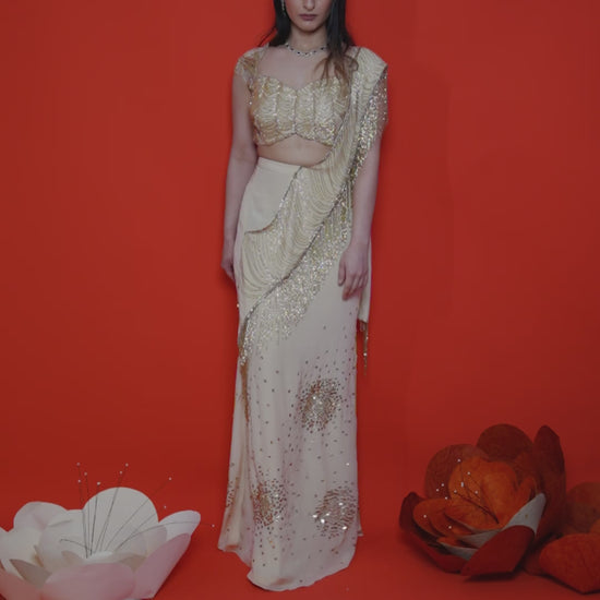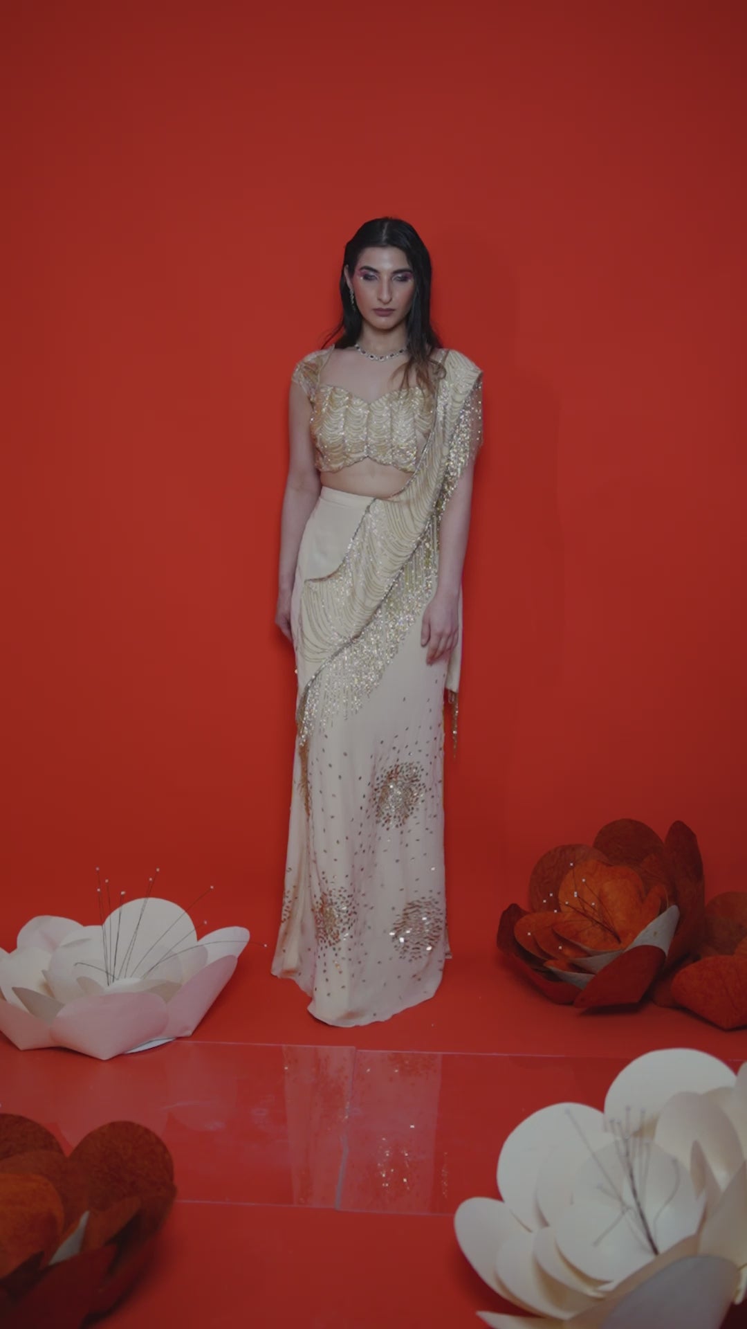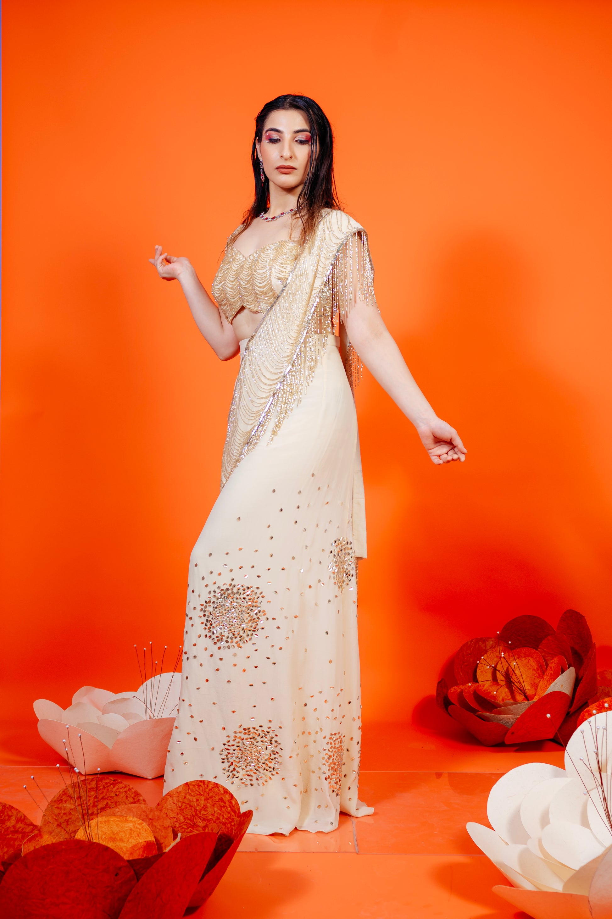The Garden Charm draped tasseled saree in off-white exudes timeless elegance and modern flair. Crafted from lightweight fabric, it features delicate tassels that add a playful touch to the classic drape. The soft off-white hue enhances its ethereal charm, making it perfect for both festive occasions and intimate gatherings. Effortlessly stylish, this saree is a versatile addition to any wardrobe.