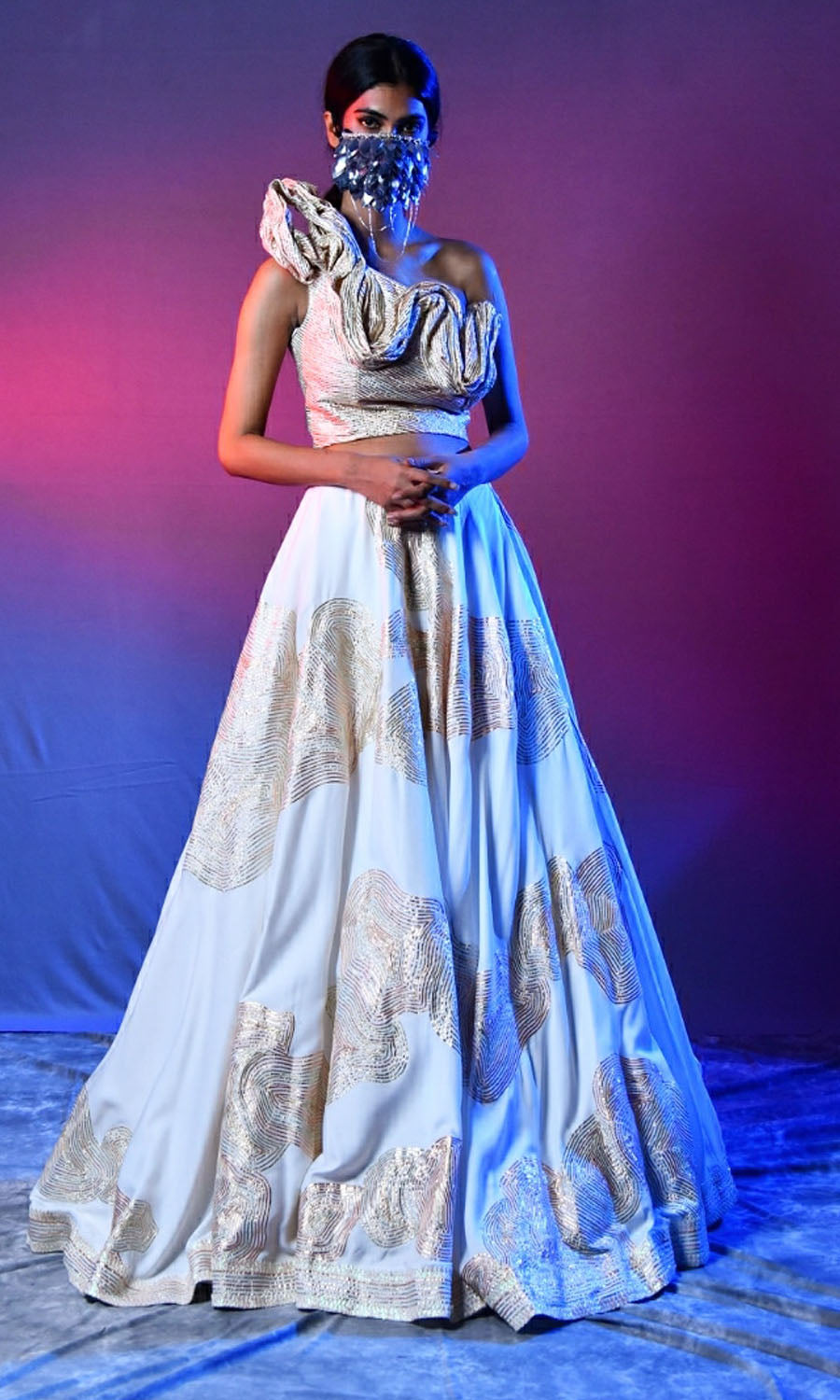 Introducing "Ivory breeze ": an opulent ivory lehenga designed to enchant on every occasion. The skirt, crafted from modal silk, is adorned with delicate baby golden hand embroidery, exuding elegance and luxury fit for a bridal lehenga or wedding outfit.