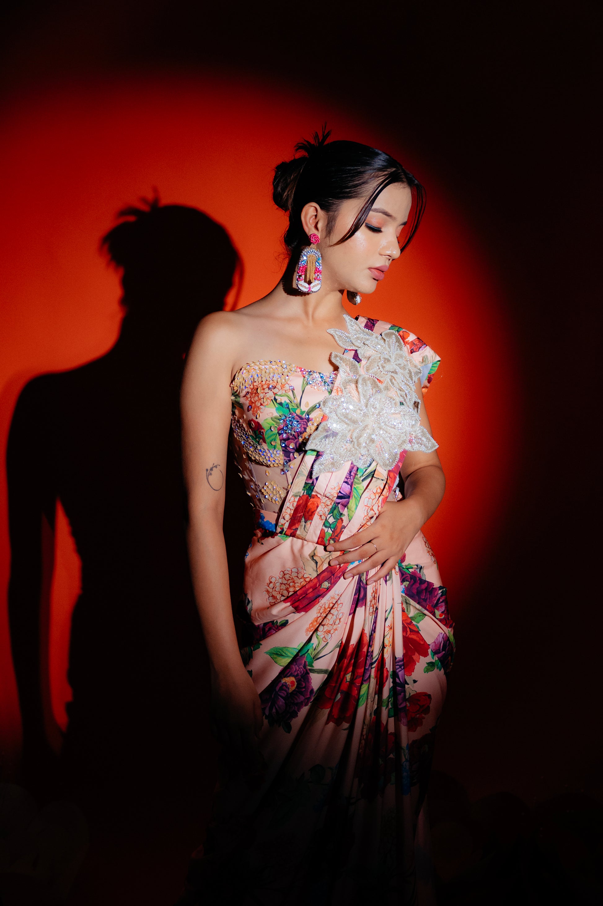 The Petal Glint printed embellished draped saree combines vibrant floral prints with exquisite embellishments for a stunning effect. The lightweight fabric drapes beautifully, enhancing the silhouette while adding a touch of glamour. Perfect for special occasions, this saree offers a modern twist on traditional elegance, making it a standout choice for any celebration.