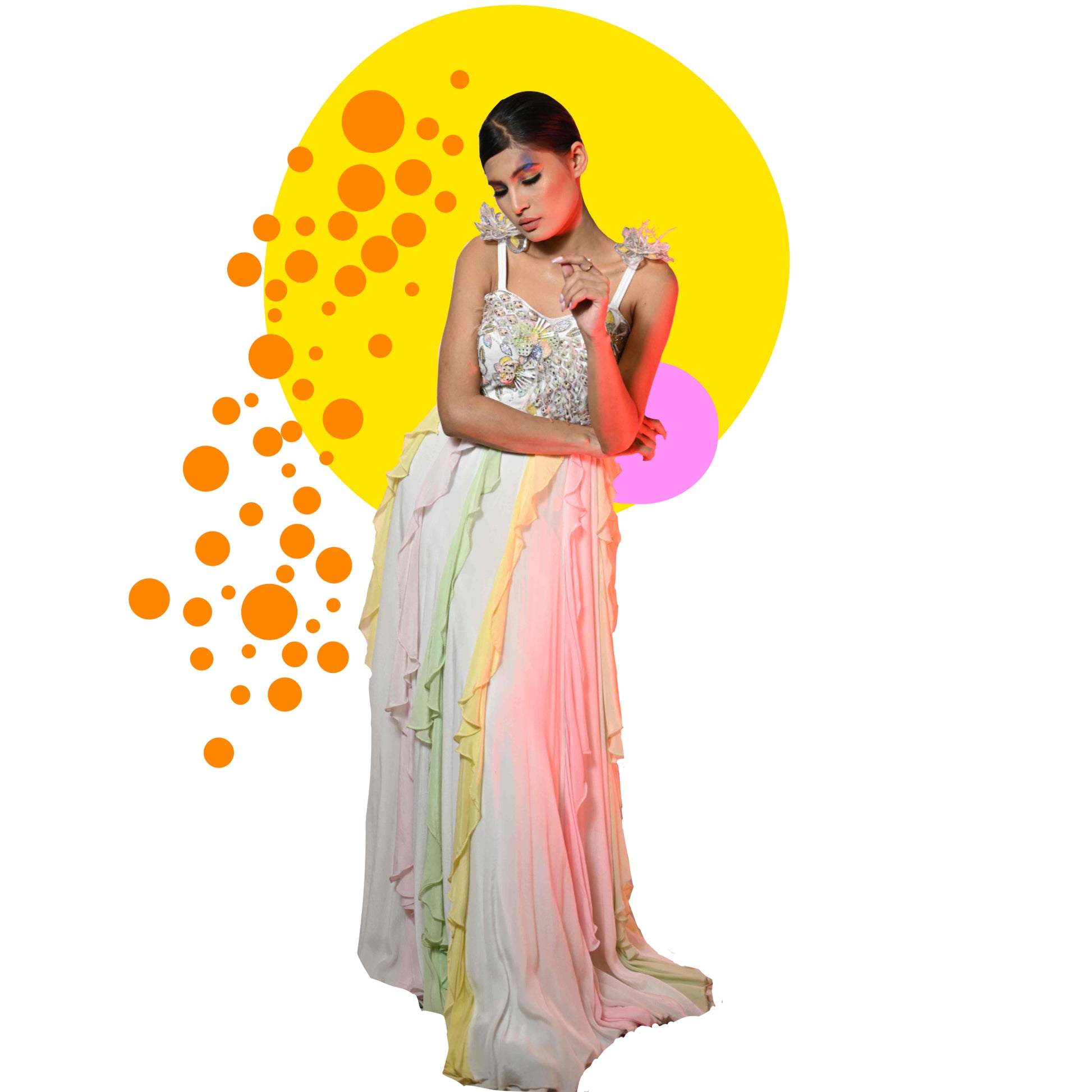 The flowing skirt, embellished with vibrant, colorful frills, adds a touch of whimsy and charm, perfect for vibrant gatherings like haldi ceremonies or as an enchanting bridesmaid dress. Whether it's for a wedding lehenga or any celebratory occasion, this gown promises to captivate with its blend of elegance and playful allure, ensuring you shine brightly at every step.